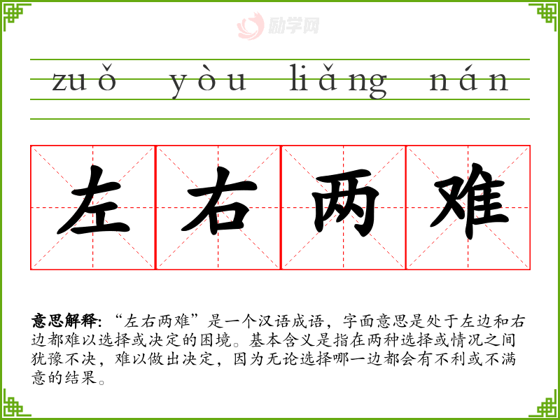 “左右两难”是一个汉语成语,字面意思是处于左边和右边都难以选择或决定的困境。基本含义是指在两种选择或情况之间犹豫不决,难以做出决定,因为无论选择哪一边都会有不利或不满意的结果。