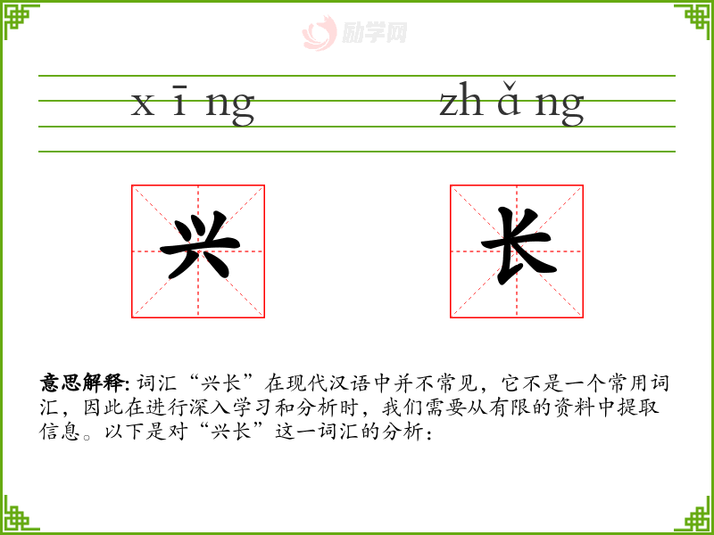 词汇“兴长”在现代汉语中并不常见,它不是一个常用词汇,因此在进行深入学*和分析时,我们需要从有限的资料中提取信息。以下是对“兴长”这一词汇的分析: