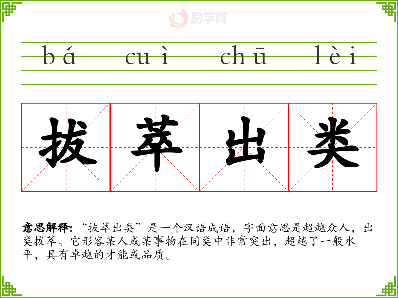“拔萃出类”源自《孟子·公孙丑上》:“出于其类,拔乎其萃。”原意是指从众多的草木中拔出最优秀的一株,后来引申为形容人或事物在同类中非常突出。