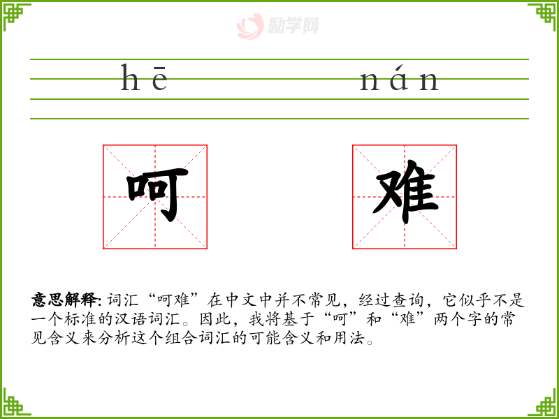 词汇“呵难”在中文中并不常见,经过查询,它似乎不是一个标准的汉语词汇。因此,我将基于“呵”和“难”两个字的常见含义来分析这个组合词汇的可能含义和用法。