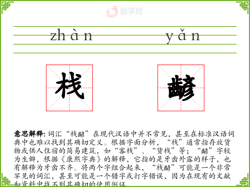词汇“栈齴”在现代汉语中并不常见,甚至在标准汉语词典中也难以找到其确切定义。根据字面分析,“栈”通常指存放货物或供人住宿的简易建筑,如“客栈”、“货栈”等;“齴”字较为生僻,根据《康熙字典》的解释,它指的是牙齿外露的样子,也有解释为牙齿不齐。将两个字组合起来,“栈齴”可能是一个非常罕见的词汇,甚至可能是一个错字或打字错误,因为在现有的文献和资料中找不到其确切的使用例证。