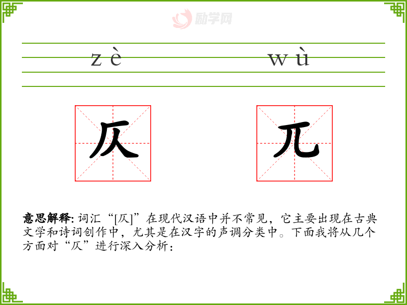 词汇“[仄]”在现代汉语中并不常见,它主要出现在古典文学和诗词创作中,尤其是在汉字的声调分类中。下面我将从几个方面对“仄”进行深入分析: