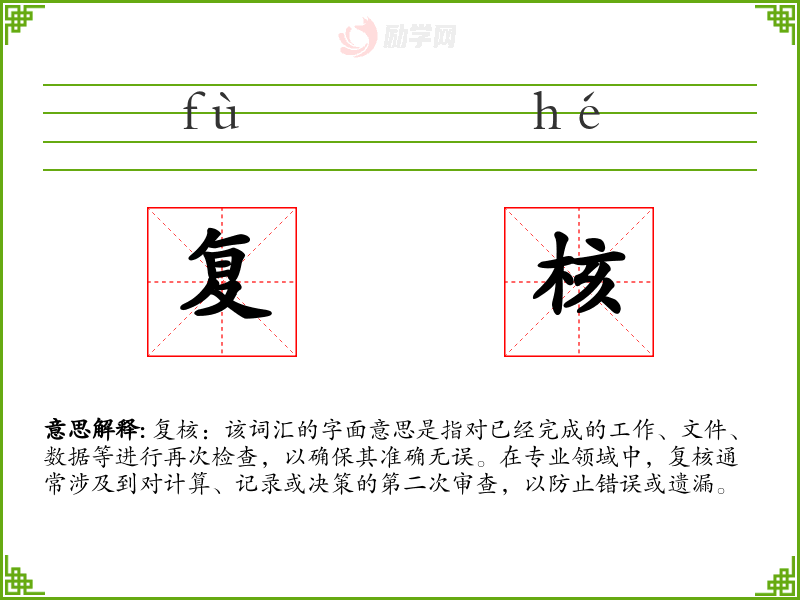 复核:该词汇的字面意思是指对已经完成的工作、文件、数据等进行再次检查,以确保其准确无误。在专业领域中,复核通常涉及到对计算、记录或决策的第二次审查,以防止错误或遗漏。