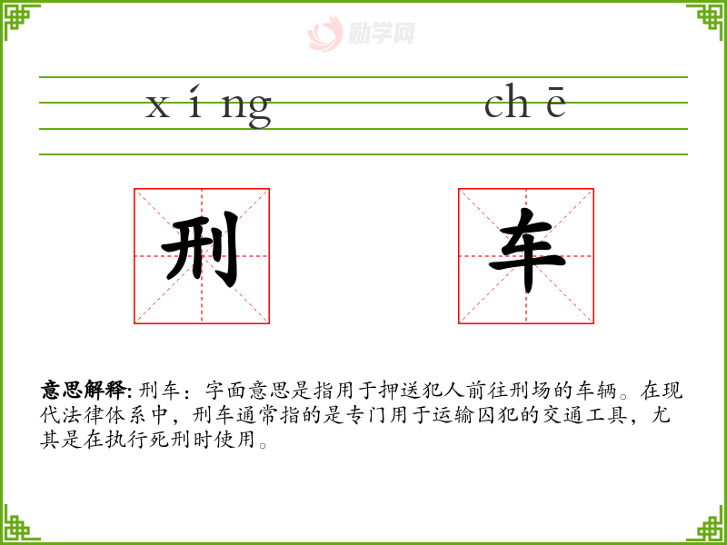 刑车:字面意思是指用于押送犯人前往刑场的车辆。在现代法律体系中,刑车通常指的是专门用于运输囚犯的交通工具,尤其是在执行死刑时使用。