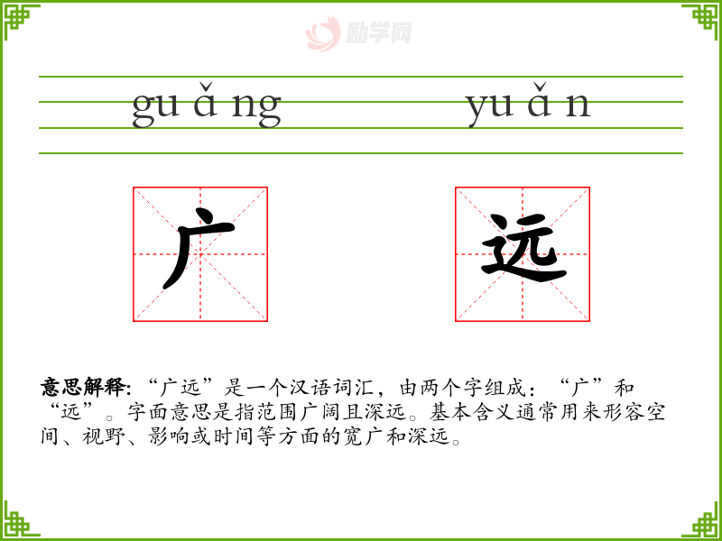 “广远”是一个汉语词汇,由两个字组成:“广”和“远”。字面意思是指范围广阔且深远。基本含义通常用来形容空间、视野、影响或时间等方面的宽广和深远。