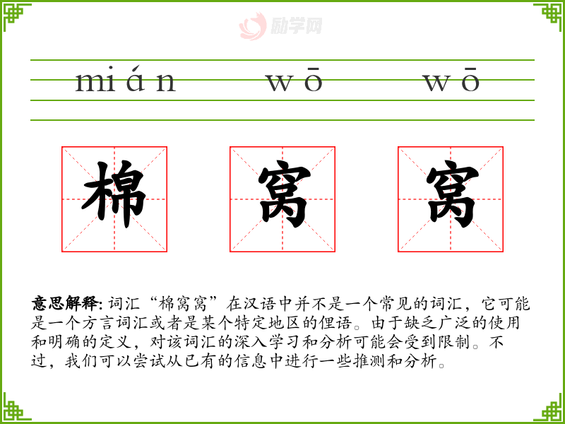由于“棉窝窝”不是一个标准汉语词汇,它在不同语境下的使用可能非常有限。在方言或特定地区的口语中,它可能用来形容一个用棉花填充的、给人温暖感觉的物品,比如一个棉垫或者棉被。