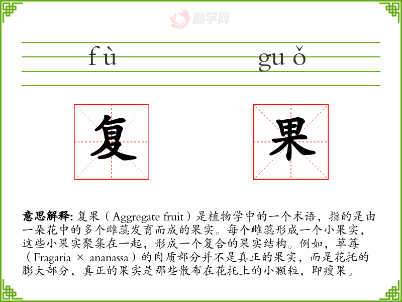 - 反义词:单果(Simple fruit),指的是由一朵花中的单个雌蕊发育而成的果实。