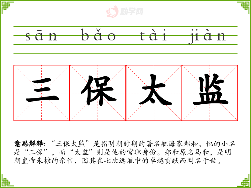 “三保太监”这个词汇不仅指代了一个历史人物,也代表了一段重要的历史时期和一种探索精神。在我的语言学*和表达中,理解和使用这个词汇有助于我更深入地理解**的历史和文化。