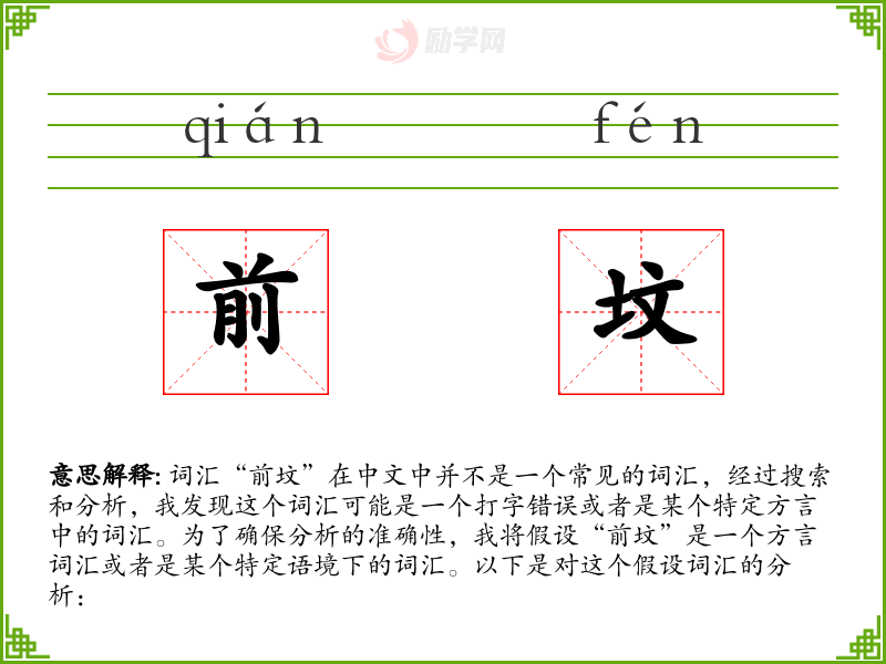 词汇“前坟”在中文中并不是一个常见的词汇,经过搜索和分析,我发现这个词汇可能是一个打字错误或者是某个特定方言中的词汇。为了确保分析的准确性,我将假设“前坟”是一个方言词汇或者是某个特定语境下的词汇。以下是对这个假设词汇的分析: