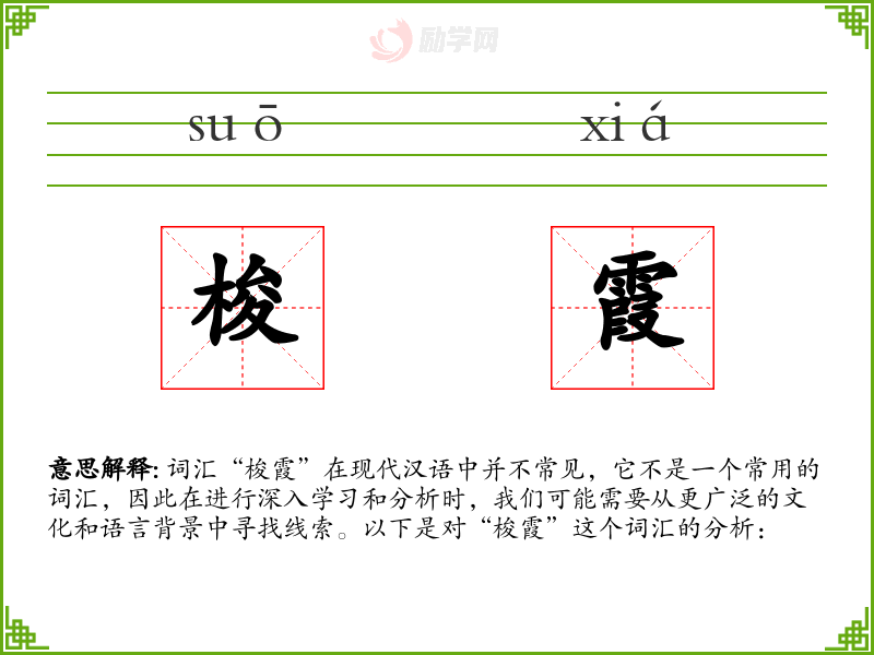 词汇“梭霞”在现代汉语中并不常见,它不是一个常用的词汇,因此在进行深入学习和分析时,我们可能需要从更广泛的文化和语言背景中寻找线索。以下是对“梭霞”这个词汇的分析: