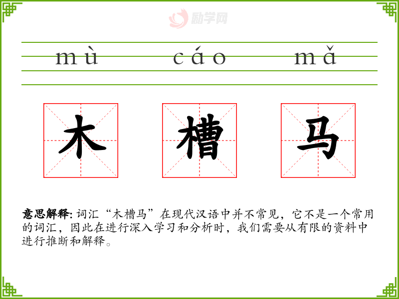词汇“木槽马”在现代汉语中并不常见,它不是一个常用的词汇,因此在进行深入学习和分析时,我们需要从有限的资料中进行推断和解释。
