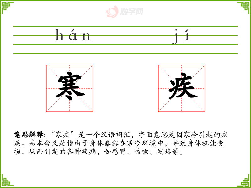 “寒疾”一词源于古代汉语,其中“寒”指寒冷,“疾”指疾病。在古代文献中,如《黄帝内经》等中医经典中,常有对“寒疾”的描述和治疗建议。随着语言的发展,“寒疾”的使用逐渐减少,被更具体的疾病名称所替代。
