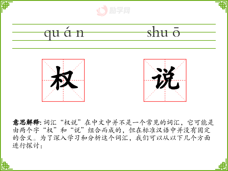 词汇“权说”在中文中并不是一个常见的词汇,它可能是由两个字“权”和“说”组合而成的,但在标准汉语中并没有固定的含义。为了深入学习和分析这个词汇,我们可以从以下几个方面进行探讨: