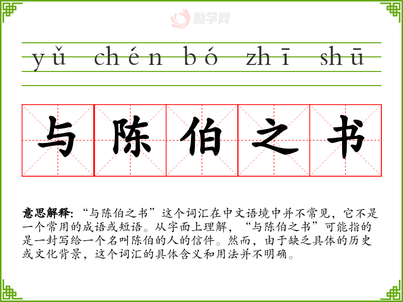 “与陈伯之书”这个词汇在中文语境中并不常见,其具体含义和用法需要更多的历史或文化背景来解释。在语言学习和表达中,这个词汇的重要性可能较低,除非在特定的历史或文学研究中。