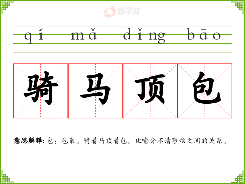 骑马顶包的意思是:包:包裹。骑着马顶着包。比喻分不清事物之间的关系。