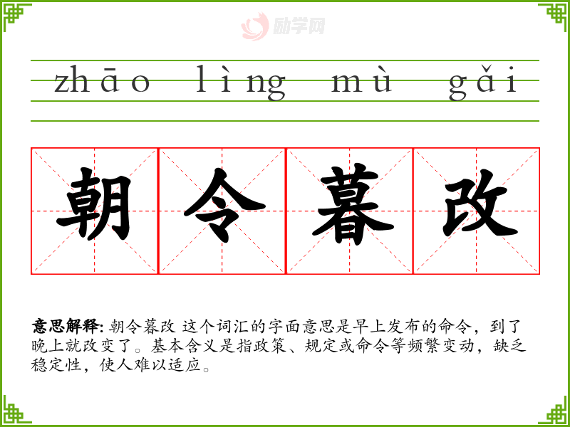 朝令暮改 这个词汇的字面意思是早上发布的命令,到了晚上就改变了。基本含义是指政策、规定或命令等频繁变动,缺乏稳定性,使人难以适应。