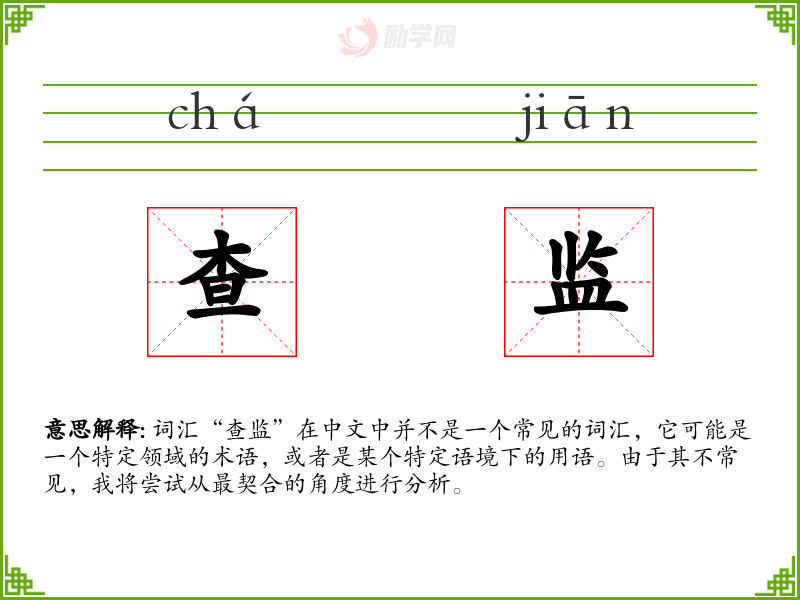 词汇“查监”在中文中并不是一个常见的词汇,它可能是一个特定领域的术语,或者是某个特定语境下的用语。由于其不常见,我将尝试从最契合的角度进行分析。