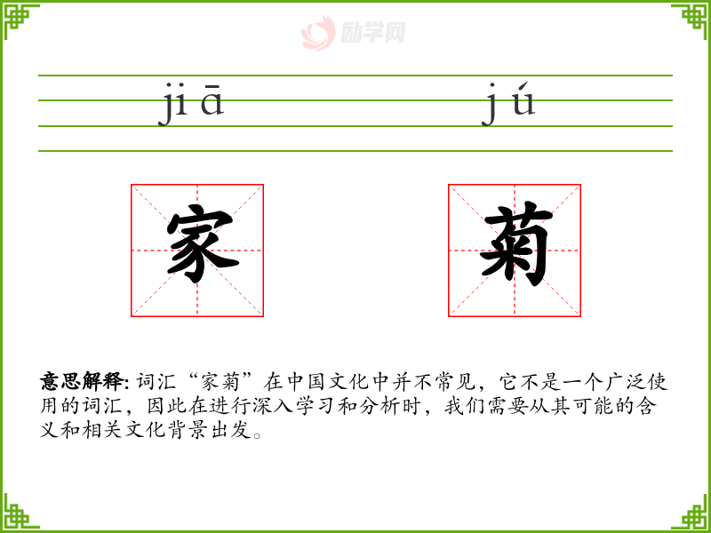 词汇“家菊”在*文化中并不常见,它不是一个广泛使用的词汇,因此在进行深入学和分析时,我们需要从其可能的含义和相关文化背景出发。