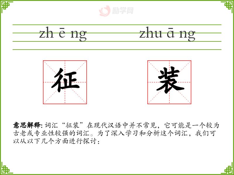 词汇“征装”在现代汉语中并不常见,它可能是一个较为古老或专业性较强的词汇。为了深入学*和分析这个词汇,我们可以从以下几个方面进行探讨: