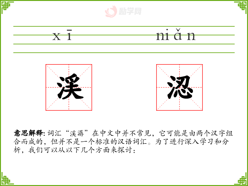 由于“渓潺”不是一个标准词汇,我们无法给出确切的基本定义。如果将其拆分为“渓”和“潺”,我们可以分别解释这两个字的意思。