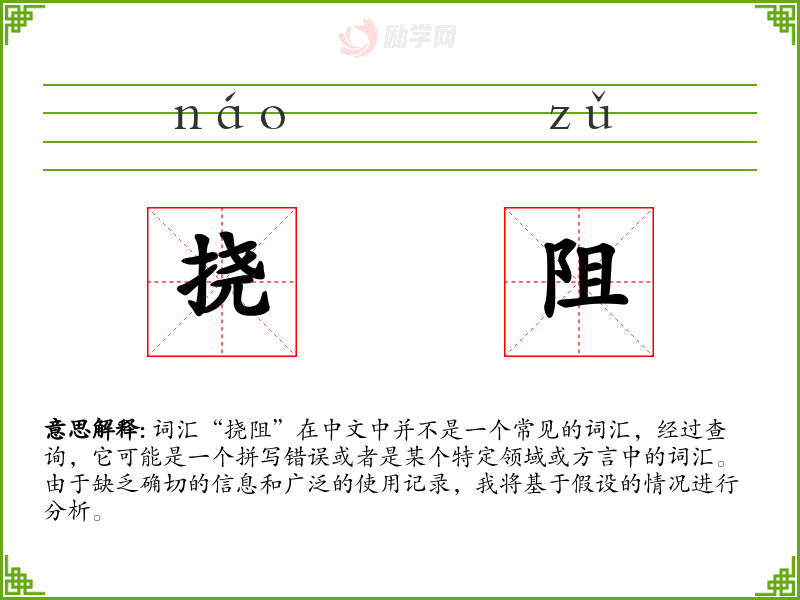 词汇“挠阻”在中文中并不是一个常见的词汇,经过查询,它可能是一个拼写错误或者是某个特定领域或方言中的词汇。由于缺乏确切的信息和广泛的使用记录,我将基于假设的情况进行分析。