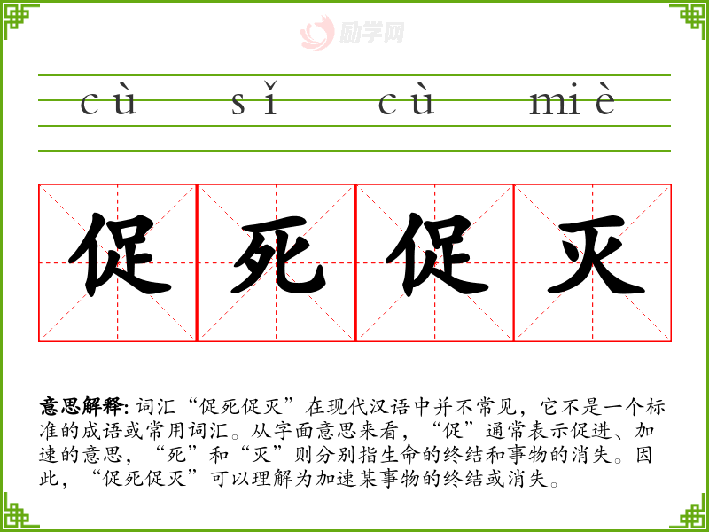 词汇“促死促灭”在现代汉语中并不常见,它不是一个标准的成语或常用词汇。从字面意思来看,“促”通常表示促进、加速的意思,“死”和“灭”则分别指生命的终结和事物的消失。因此,“促死促灭”可以理解为加速某事物的终结或消失。