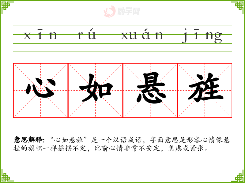 “心如悬旌”是一个汉语成语,字面意思是形容心情像悬挂的旗帜一样摇摆不定,比喻心情非常不安定,焦虑或紧张。