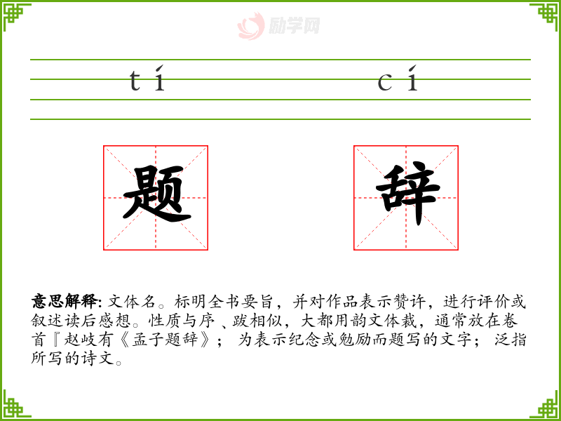 文体名。标明全书要旨,并对作品表示赞许,进行评价或叙述读后感想。性质与序﹑跋相似,大都用韵文体裁,通常放在卷首『赵岐有《孟子题辞》; 为表示纪念或勉励而题写的文字; 泛指所写的诗文。