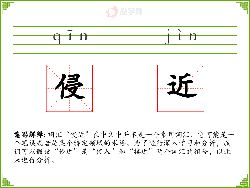 词汇“侵近”在中文中并不是一个常用词汇,它可能是一个笔误或者是某个特定领域的术语。为了进行深入学习和分析,我们可以假设“侵近”是“侵入”和“接近”两个词汇的组合,以此来进行分析。