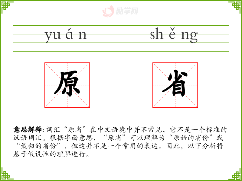 词汇“原省”在中文语境中并不常见,它不是一个标准的汉语词汇。根据字面意思,“原省”可以理解为“原始的省份”或“最初的省份”,但这并不是一个常用的表达。因此,以下分析将基于假设性的理解进行。