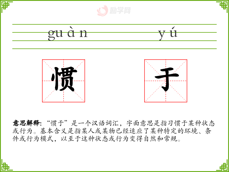 “惯于”源自古代汉语,其中“惯”字最初指惯或以为常,而“于”是一个介词,表示在某种状态或环境中。随着时间的推移,这个词汇的用法和含义基本保持稳定。