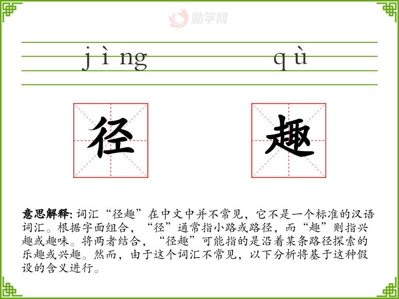 词汇“径趣”在中文中并不常见,它不是一个标准的汉语词汇。根据字面组合,“径”通常指小路或路径,而“趣”则指兴趣或趣味。将两者结合,“径趣”可能指的是沿着某条路径探索的乐趣或兴趣。然而,由于这个词汇不常见,以下分析将基于这种假设的含义进行。