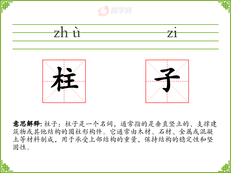 柱子:柱子是一个名词,通常指的是垂直竖立的、支撑建筑物或其他结构的圆柱形构件。它通常由木材、石材、金属或混凝土等材料制成,用于承受上部结构的重量,保持结构的稳定性和坚固性。