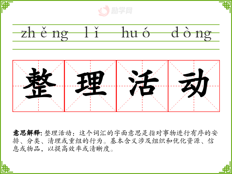 整理活动:这个词汇的字面意思是指对事物进行有序的安排、分类、清理或重组的行为。基本含义涉及组织和优化资源、信息或物品,以提高效率或清晰度。