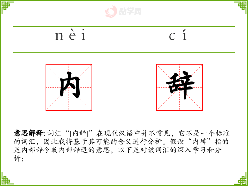 词汇“[内辞]”在现代汉语中并不常见,它不是一个标准的词汇,因此我将基于其可能的含义进行分析。假设“内辞”指的是内部辞令或内部辞退的意思,以下是对该词汇的深入学习和分析: