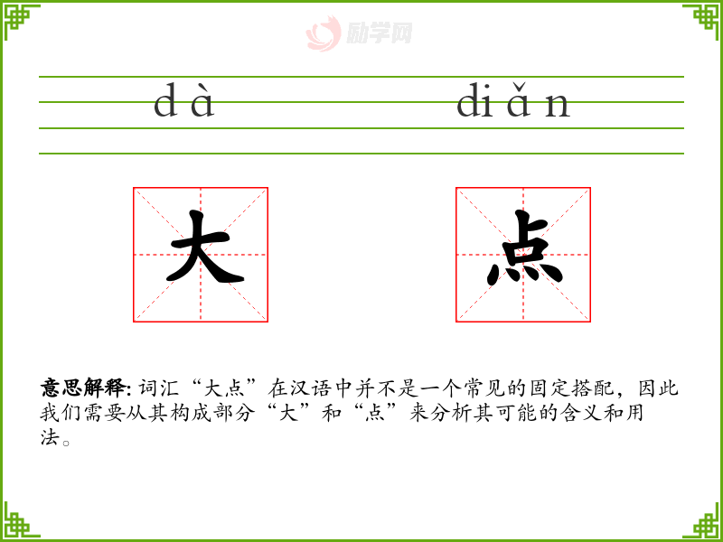 词汇“大点”在汉语中并不是一个常见的固定搭配,因此我们需要从其构成部分“大”和“点”来分析其可能的含义和用法。
