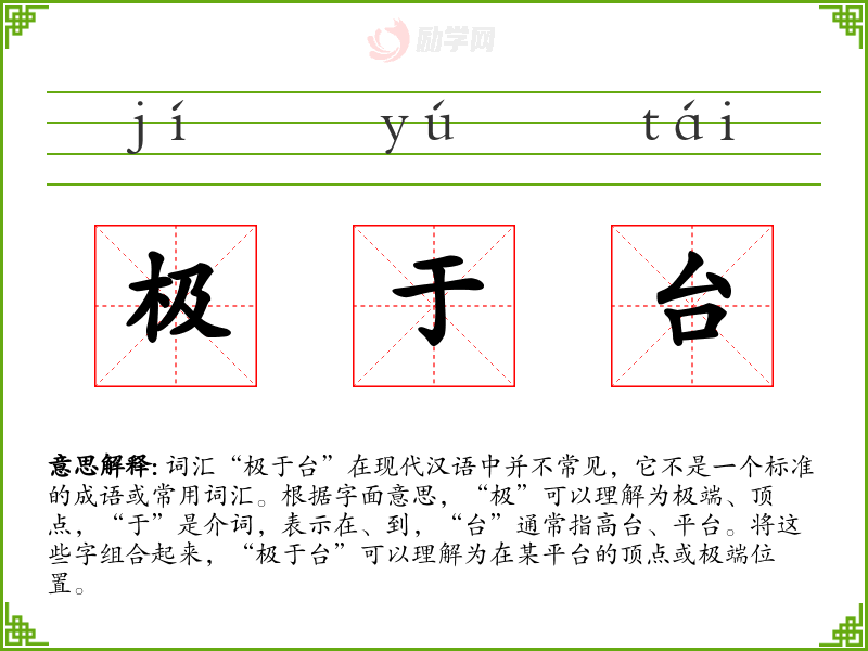 在古代**,高台常用于观景或举行仪式,因此“极于台”可能带有一定的历史和文化背景,但在现代社会中,这一词汇的使用非常有限。