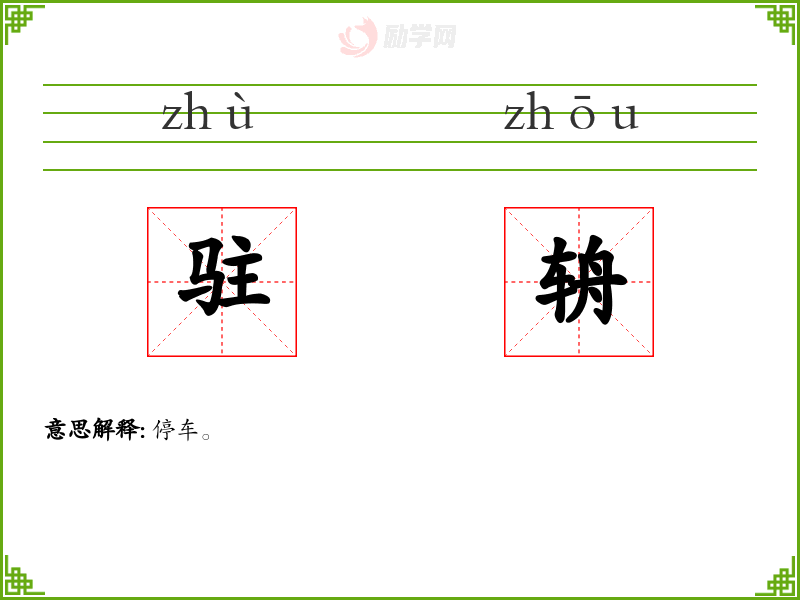 《说文》-驻,马立也。 《后汉书·灵帝纪》。注:“停车处也。”-驻驾。 《苍颉篇》-驻,止也。 《文选·班昭·东征赋》-怅容与而久驻兮。 宋之问《上巳泛舟昆明池宴宗主簿席序》-主称未醉,惟见马驻。