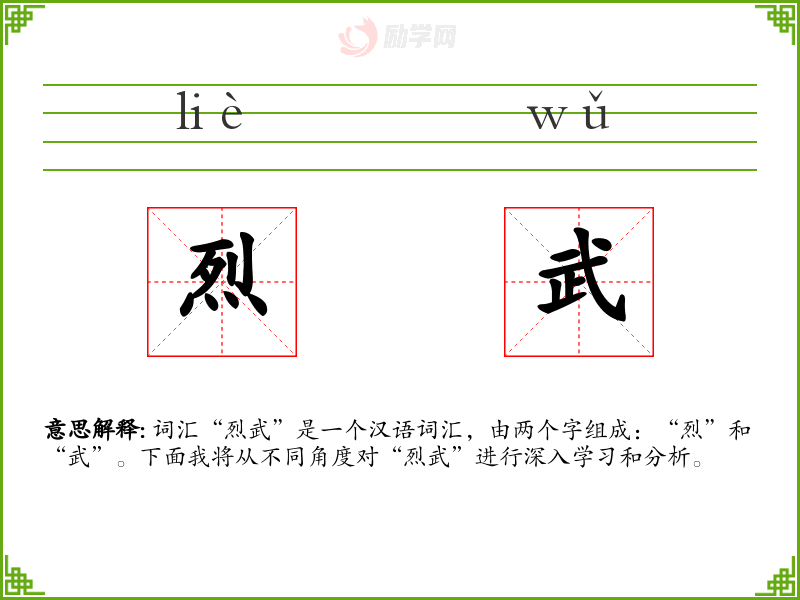 - 理解:通过对“烈武”的深入学*,我更加理解了它在不同语境中的用法和意义,以及它在文化和历史中的重要性。
