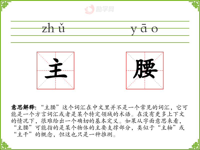 “主腰”这个词汇在中文里并不是一个常见的词汇,它可能是一个方言词汇或者是某个特定领域的术语。在没有更多上下文的情况下,很难给出一个确切的基本定义。如果从字面意思来看,“主腰”可能指的是某个物体的主要支撑部分,类似于“主轴”或“主干”的概念,但这也只是一种推测。