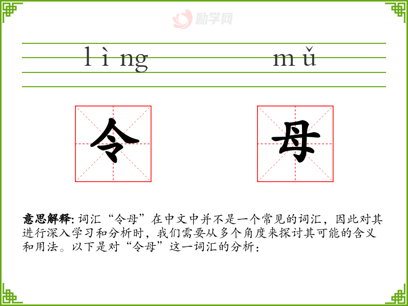 词汇“令母”在中文中并不是一个常见的词汇,因此对其进行深入学*和分析时,我们需要从多个角度来探讨其可能的含义和用法。以下是对“令母”这一词汇的分析: