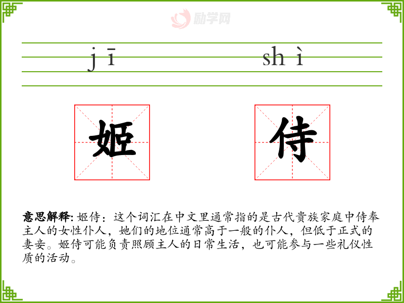 “姬”字在古代汉语中指的是美女,也常用来指代贵族妇女。而“侍”则是服务、侍奉的意思。随着时间的推移,“姬侍”这个词逐渐固定下来,指代那些在贵族家庭中服务的女性。