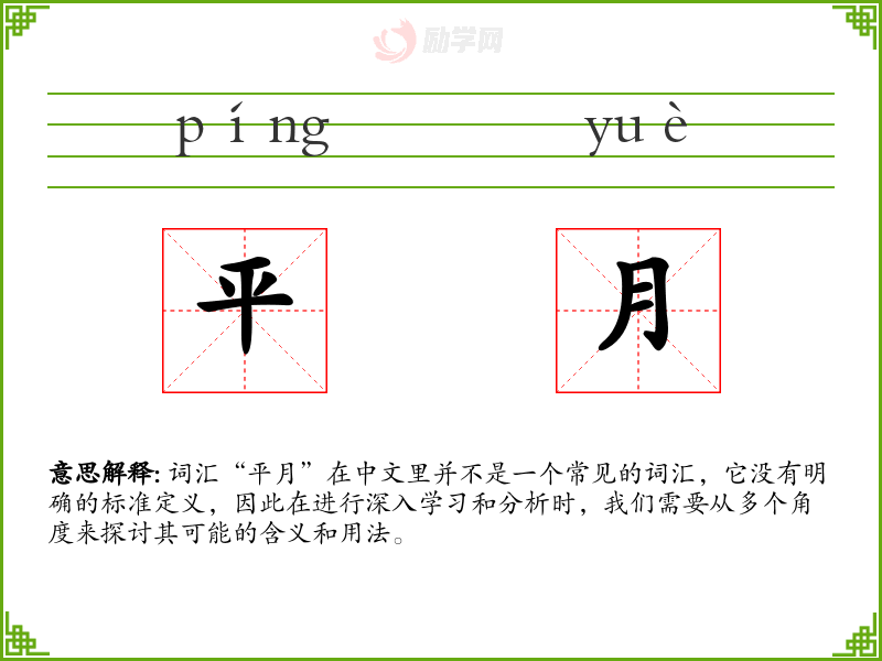 由于“平月”不是一个标准词汇,我们可以尝试从字面意思来理解。"平"可以指平稳、平均、平坦等含义,"月"则通常指月份或月亮。结合起来,“平月”可能指的是一个平稳的月份,或者是一个月份中的平均状态。