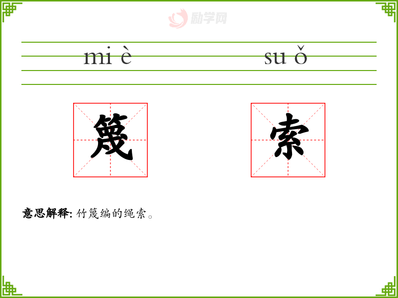 《说文》-索,草有茎叶可作绳索。 司马迁《报任安书》-其次关木索,被箠楚受辱。 《列士·天瑞》-鹿裘带索,鼓琴而歌。 《后汉书·段颍传》-追讨南度河,使军吏田晏、夏育慕先登,悬索相引。复战于罗亭,大破之。 《诗·豳风·七月》-昼尔于茅,宵而索綯。