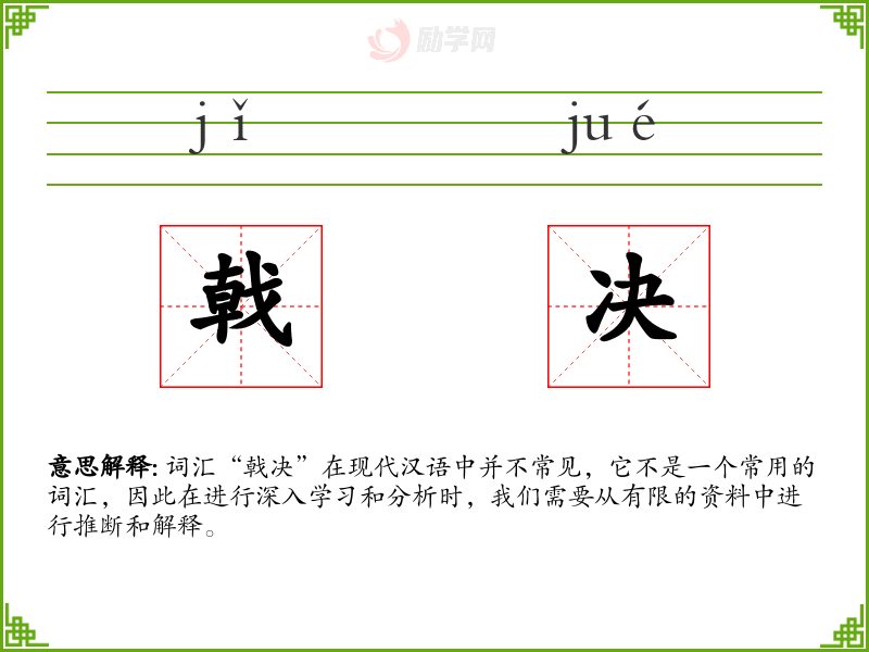 词汇“戟决”在现代汉语中并不常见,它不是一个常用的词汇,因此在进行深入学习和分析时,我们需要从有限的资料中进行推断和解释。