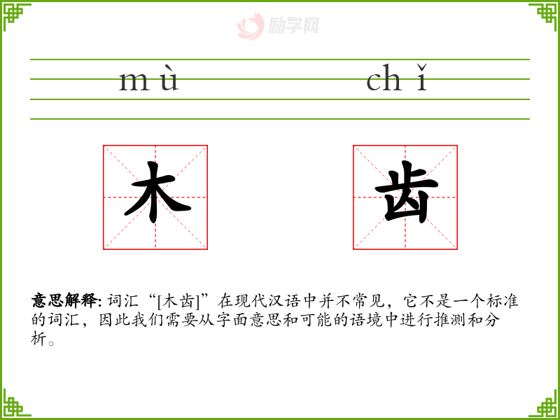 词汇“[木齿]”在现代汉语中并不常见,它不是一个标准的词汇,因此我们需要从字面意思和可能的语境中进行推测和分析。