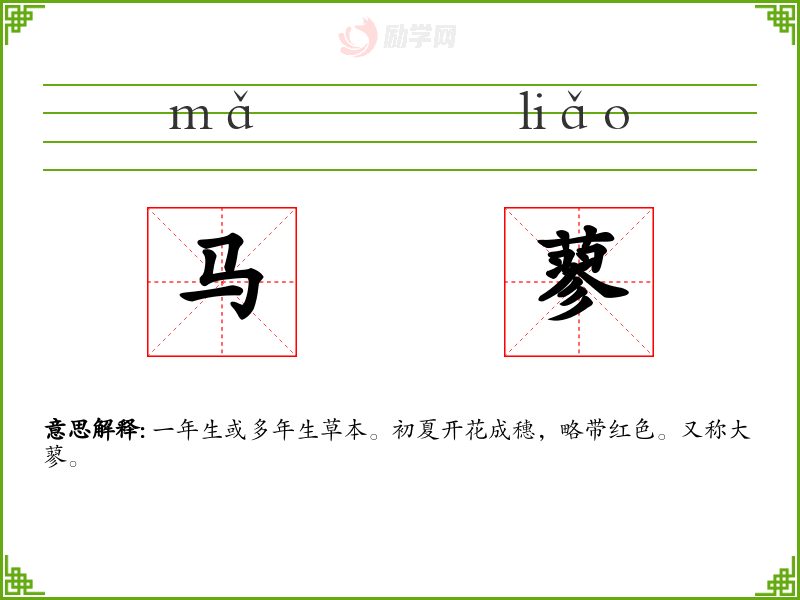 马蓼的意思是:一年生或多年生草本。初夏开花成穗,略带红色。又称大蓼。