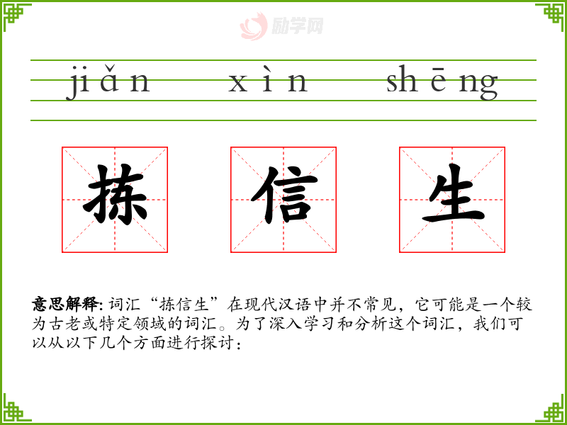 词汇“拣信生”在现代汉语中并不常见,它可能是一个较为古老或特定领域的词汇。为了深入学习和分析这个词汇,我们可以从以下几个方面进行探讨: