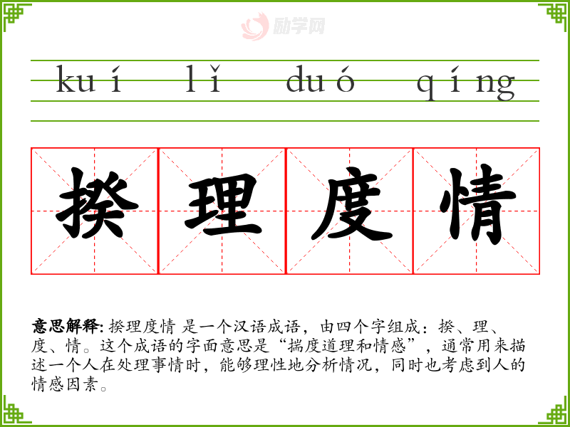揆理度情 是一个汉语成语,由四个字组成:揆、理、度、情。这个成语的字面意思是“揣度道理和情感”,通常用来描述一个人在处理事情时,能够理性地分析情况,同时也考虑到人的情感因素。