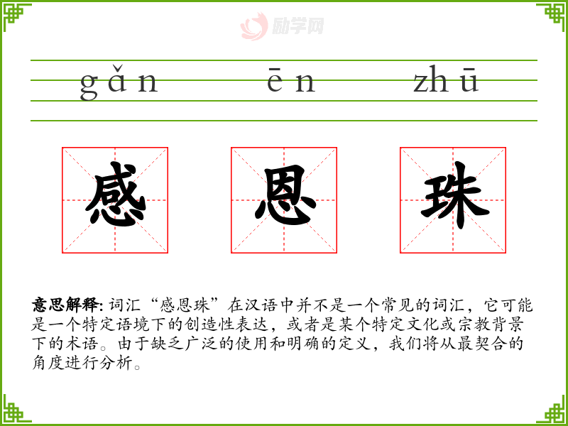 - 反义词:无(由于“感恩珠”不是一个常用词汇,反义词不适用)
